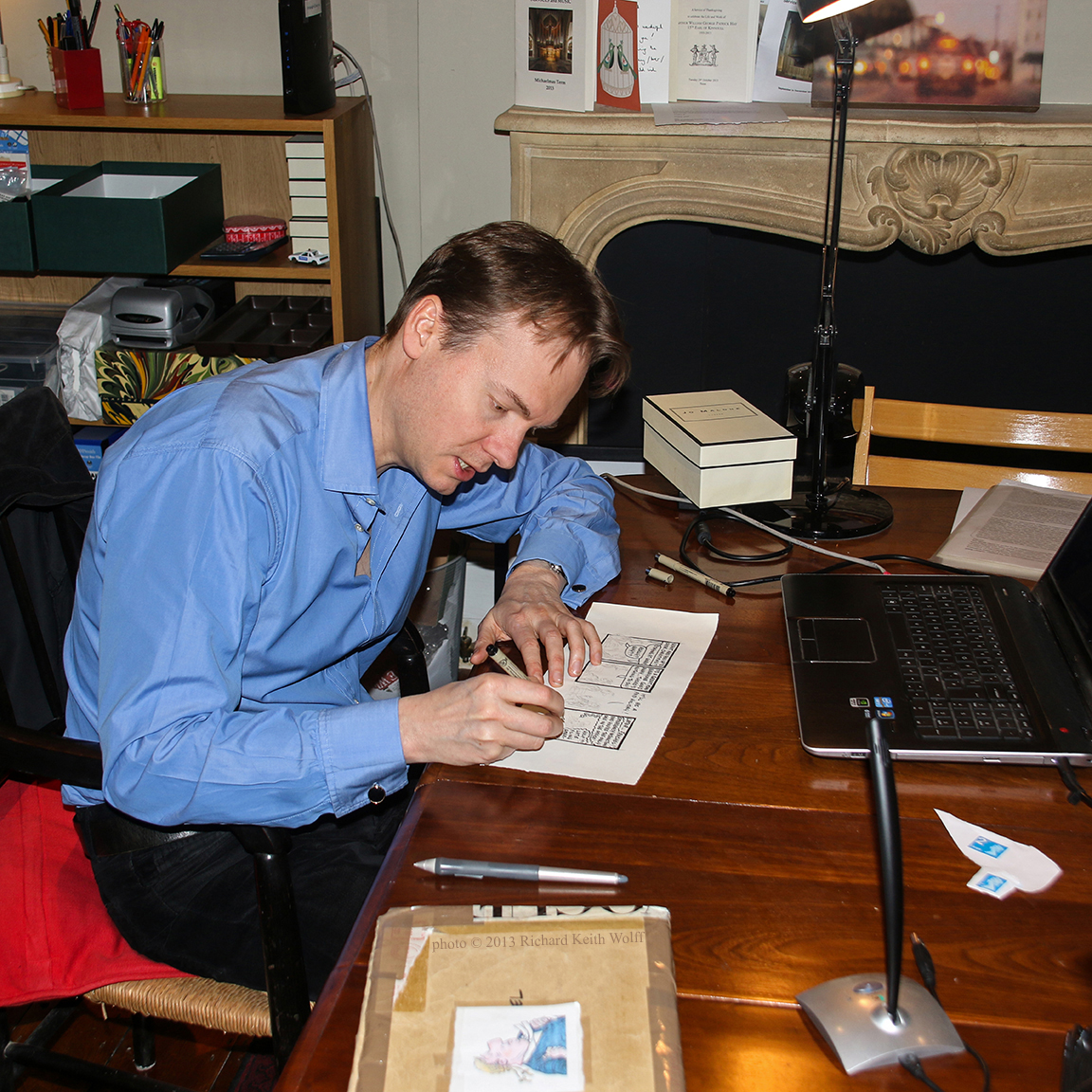 Alex Williams, film animator, and newspaper cartoonist drawing his cartoon strip for the Times newspaper, under his pen name Steuart. Shepherd’s Bush, London, UK, 22 November 2013 photo by Richard Keith Wolff
