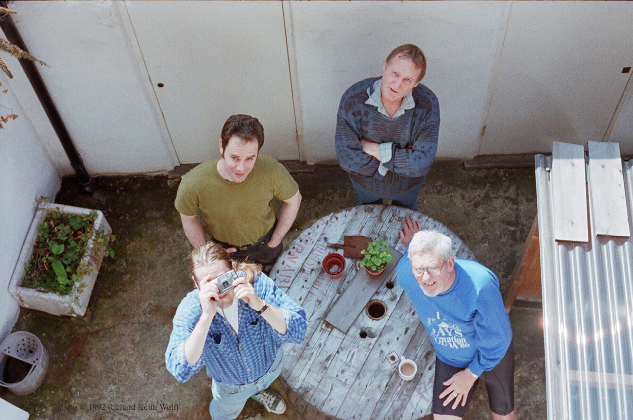 Mike Hays (1939 – 2018) at back, Bob Godfrey front right, Neil Salmon with camera and Kevin Baldwin behind centre left. Bob Godfrey Films. Kings Cross, London, UK, September 1992 photo by Richard Keith Wolff