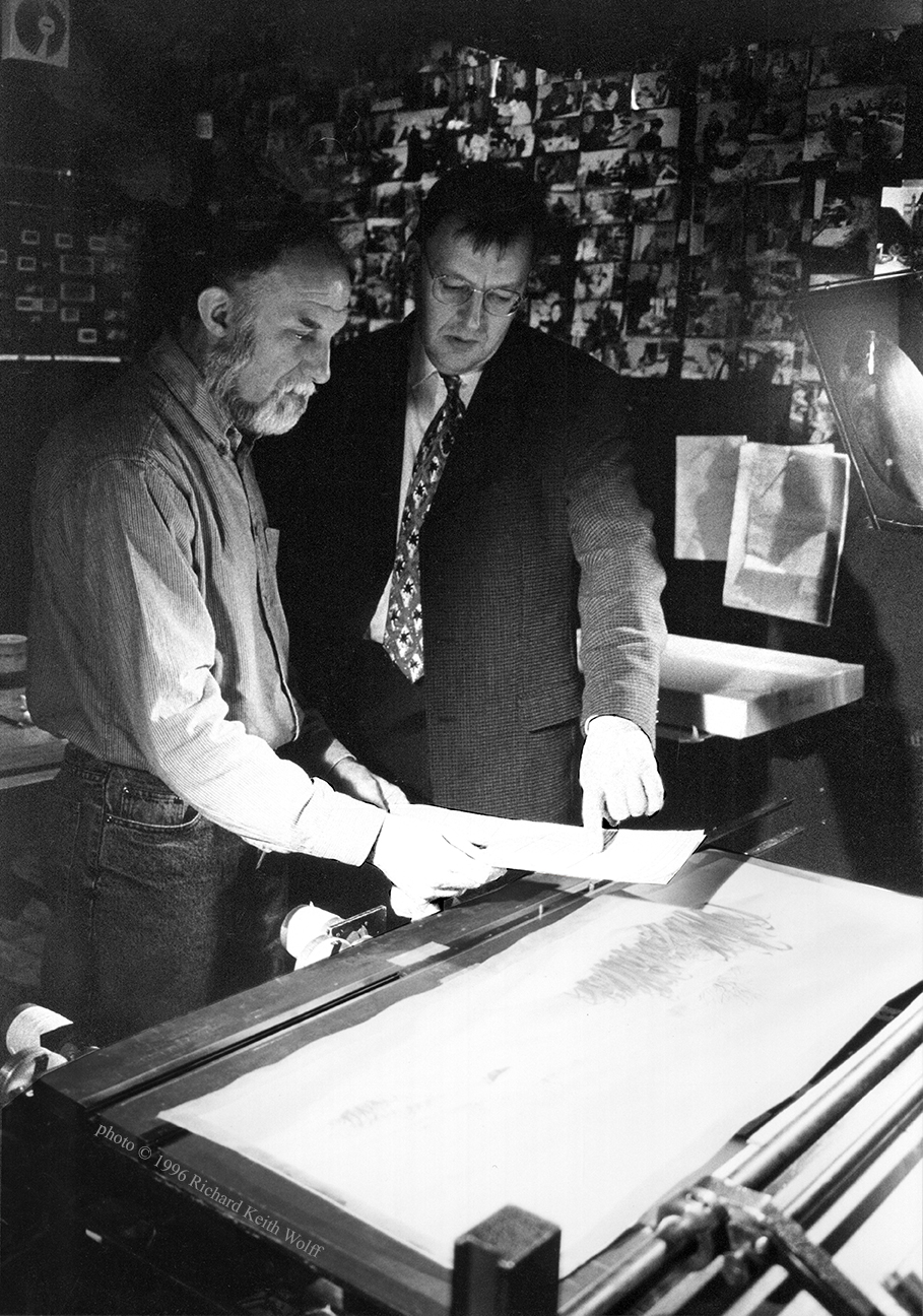 Dave Unwin, animation director with Ted Walker (1934 – 2004) scriptwriter of “Wind in the Willows” & “Willows in Winter” TVC / Carltoon Communication, in the rostrum camera room during filming. Fitzrovia, London, UK, 1996 photo by Richard Keith Wolff