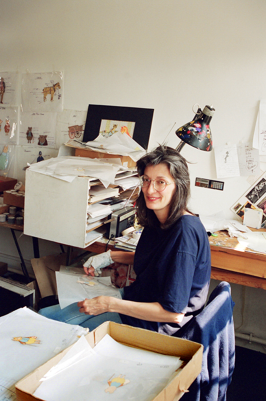 Susan Young, animation artist, auteur filmmaker working on her film. South Bank, London, UK, 1997. photo by Richard Keith Wolff