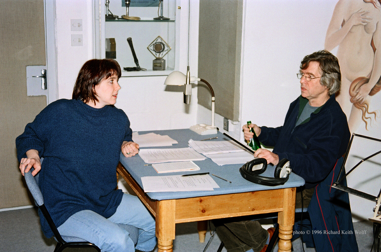Joanna Quinn directing the actor Tom Courtenay who is recording the voice-over in her animation film “Famous FRED” based on a book by Posy Simmonds. At Bell Voice recording studio. Soho, London, UK, 1996. photo by Richard Keith Wolff