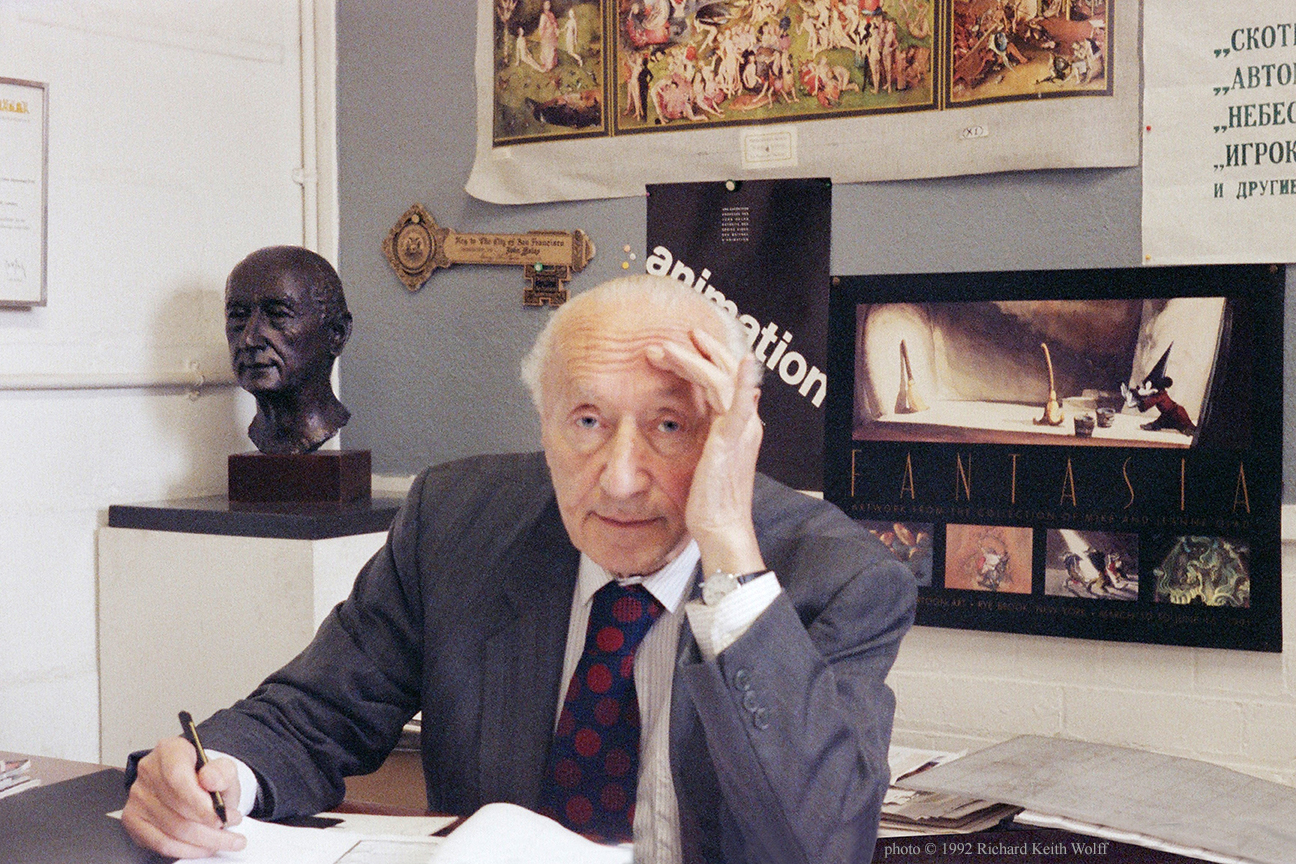 Yuri Norstein and Jules Engel (1909 – 2003), attending the Cardiff International Animation Festival 94. Yuri Norstein Russian animator film director, with American (Hungarian) filmmaker, animator, artist and teacher at CalArts, Cardiff, Wales, UK, May 1994 photo by Richard Keith Wolff
