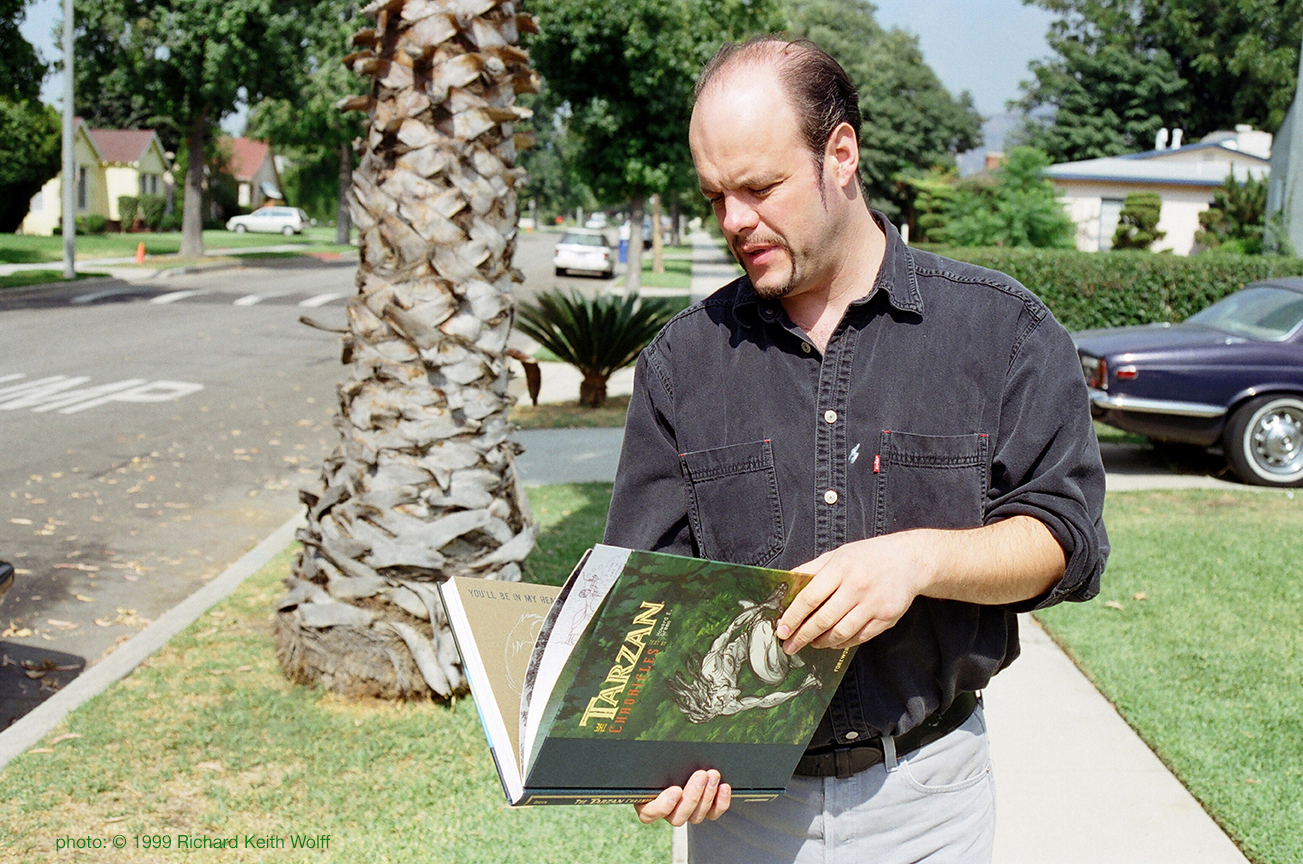 John Watkiss (1961 – 2017) artist is looking at “The Tarzan Chronicles”. John Watkiss was a conceptual artist who set the visual style of “Tarzan” Disney animation feature film released 1999. Los Angeles, CA, USA, Oct 1999. photo: Richard Keith Wolff