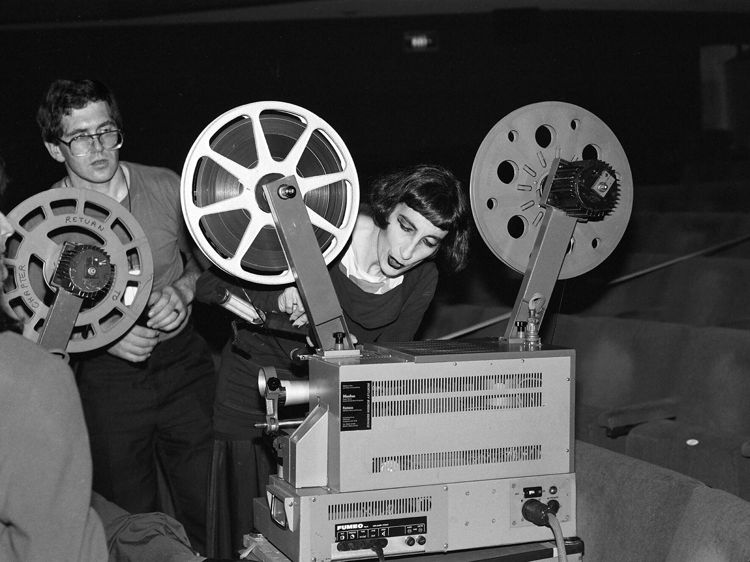 Kathy Rose dancer animator, with the projectionist, checking the projector that is being used in her performance of combined dancing and animation film, at the Cardiff International Animation Festival 1994, Cardiff, Wales, UK, May 1994 photo by Richard Keith Wolff