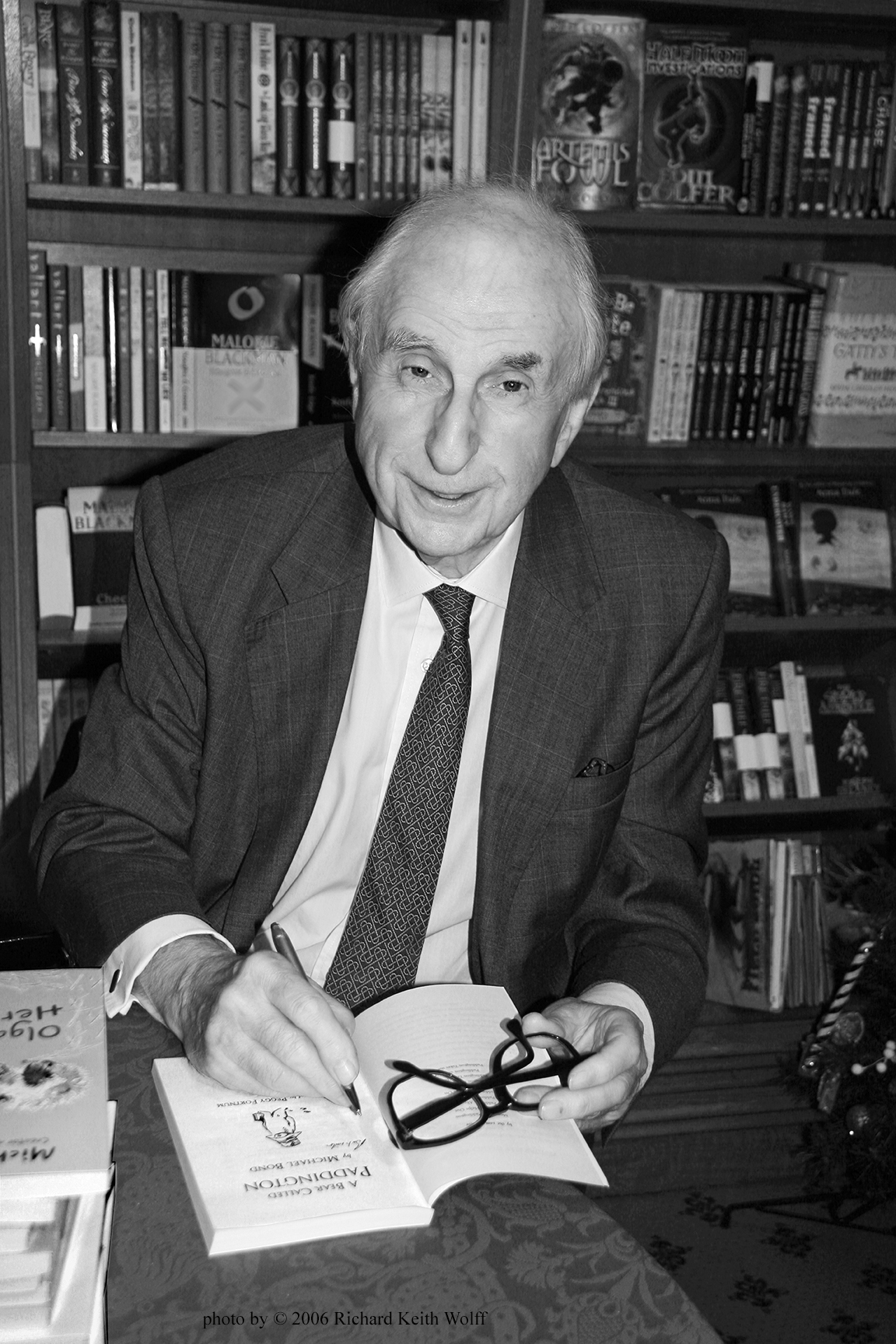 Michael Bond (1926 – 2017) creator of the Paddington Bear, at Hatchards. Piccadilly, London, UK, 30 November 2006. photo by Richard Keith Wolff