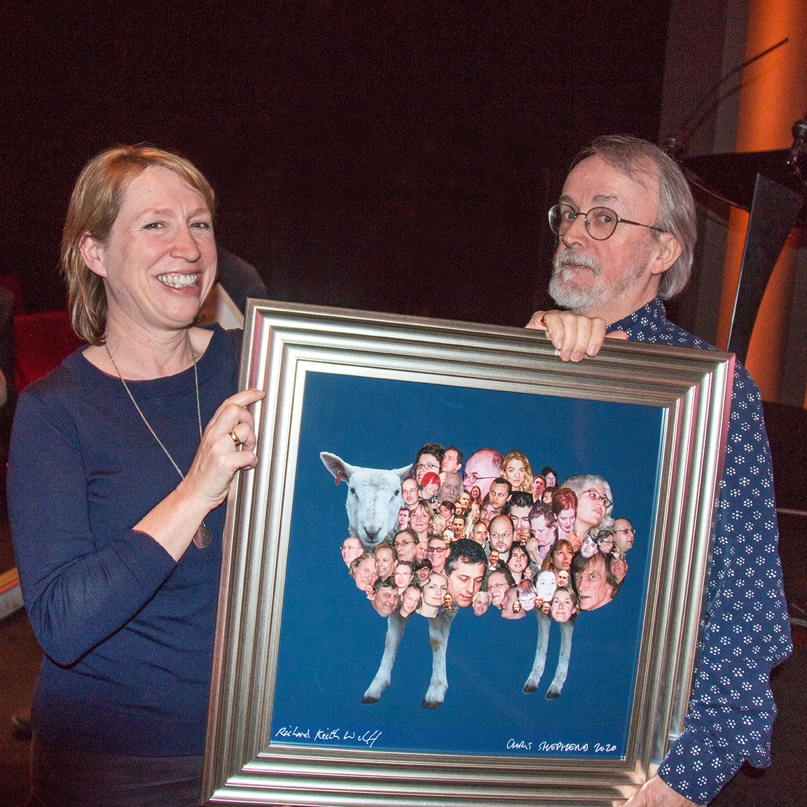 Peter Lord and Sarah Cox, for Aardman Animations, holding a BAA2020 Award for: “Shaun the Sheep, Squirreled Away” Year : 2020, Category: Children’s Choice Award; Director: Carmen Bromfield-Mason and Producer: Aardman Animations. Prize artwork created by Chris Shepherd & Richard Keith Wolff for BAA. Southbank, London, UK, 12/03/2020