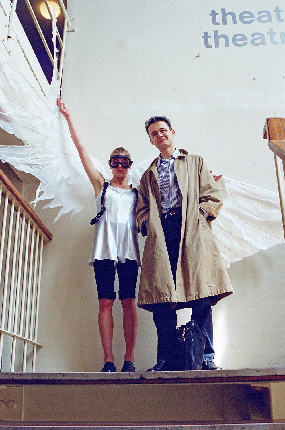 Simon Pummell, English filmmaker who uses both animation and live action in his films, attending the International Animation Festival, Cardiff 94. An ‘angel’, that happened to be flying by, kindly posed as requested, with the director of “Secret Joy of Falling Angels” Simon Pummell. Cardiff, Wales, May 1994 photo by Richard Keith Wolff