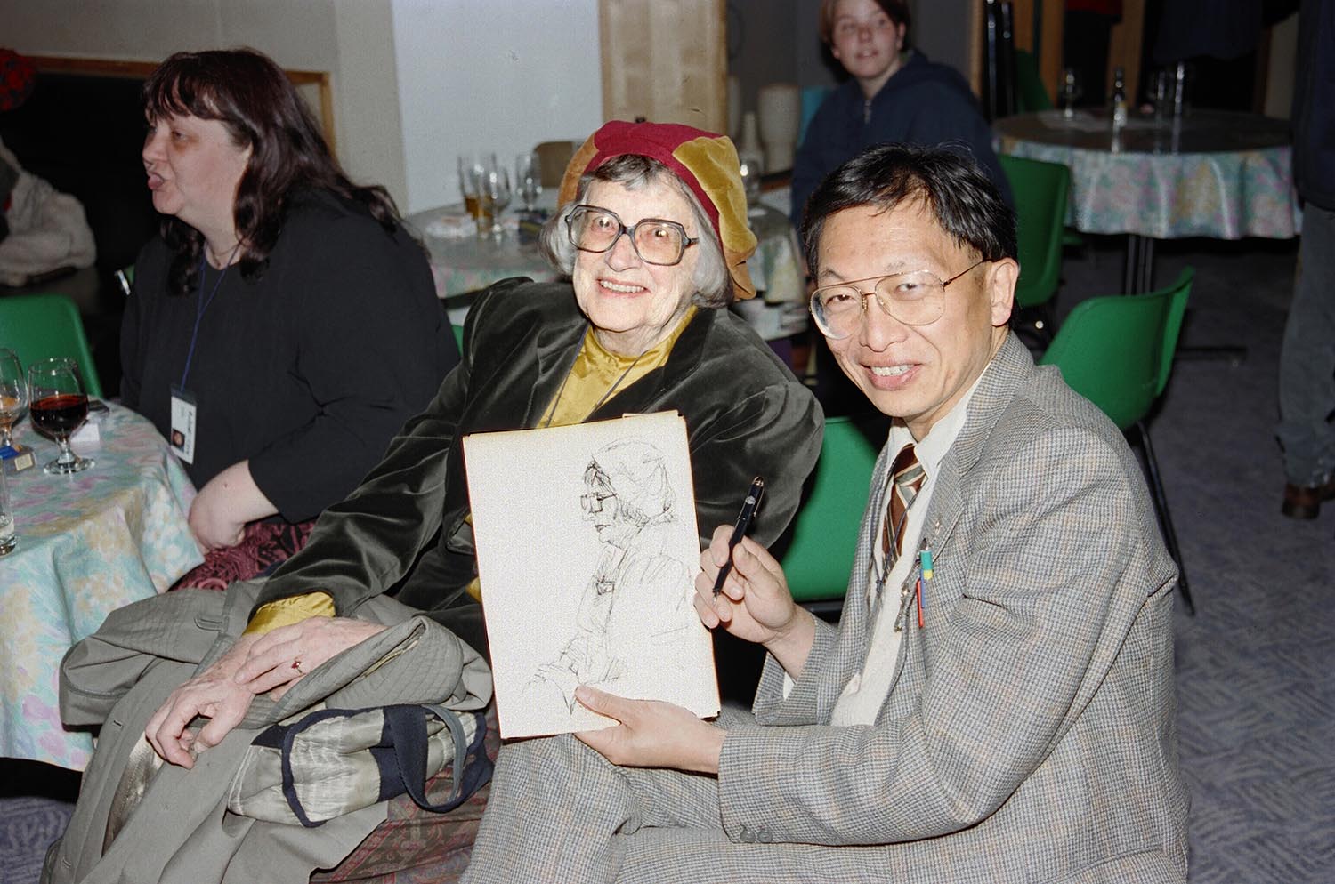 Spud Huston and Ian Moo Young holding his sketch of Spud Huston. Spud Huston (1910 – 1995) & Ian Moo-Young, animation film makers attending the Cardiff International Animation Festival. Cardiff, Wales, UK, 22 May 1994 photo by Richard Keith Wolff