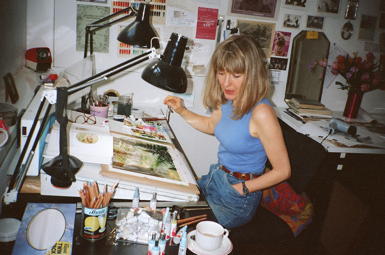 Sue Branch (1946-1998) animation background painter and artist working in her studio. Duck Lane, Soho, London, UK, 1992. photo by Richard Keith Wolff.
